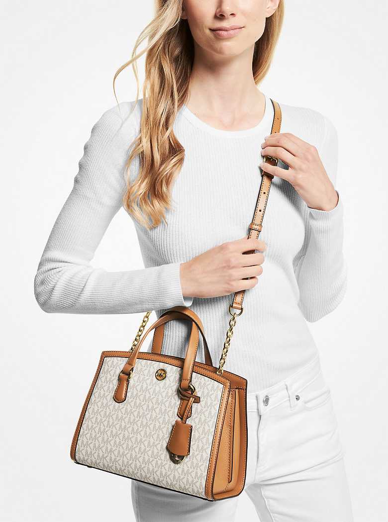 With its structured silhouette and glamorous hardware, our leather-trimmed Chantal messenger bag is a must-have in any sophisticated wardrobe. It’s made from Signature-print canvas and features a zipped compartment that will safely stow smaller items. Carry it by the sturdy top handles, or via the detachable chain-link crossbody strap on busier days.