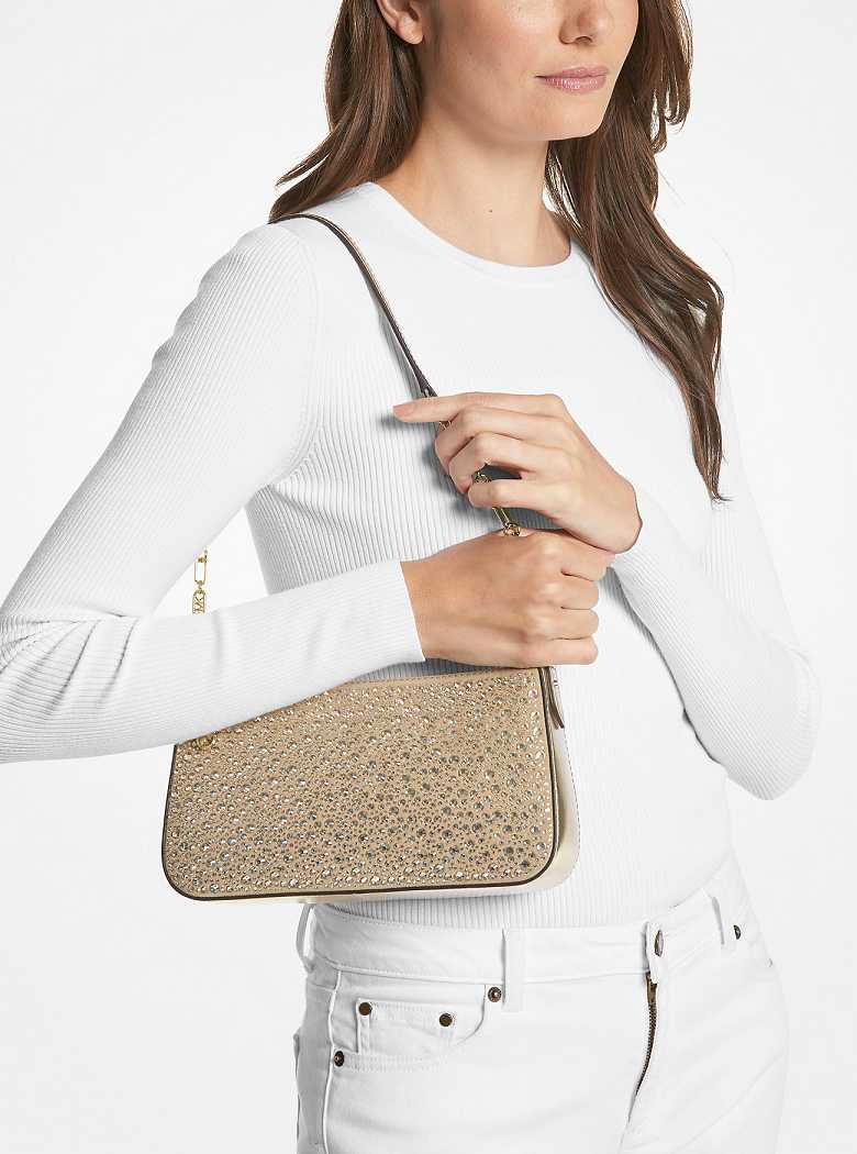 This suede pochette bag will add a playful wink to any evening look. Designed with allover glittering embellishments and high-shine metallic trim, the compact silhouette fits your phone, cardholder, sunglasses and a little extra. Style yours with an LBD to really let it shine.