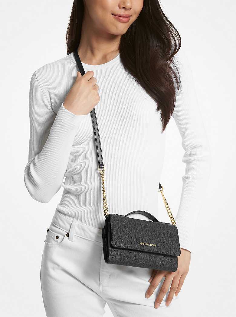 Crafted from Signature-print canvas with smooth trim, the Jet Set Travel smartphone bag complements everyday looks. Complete with an adjustable chain-link strap for versatility, the fold-over design reveals an assortment of pockets for card and bills, plus a zipper compartment for coins. Carry yours crossbody or by the top handle.