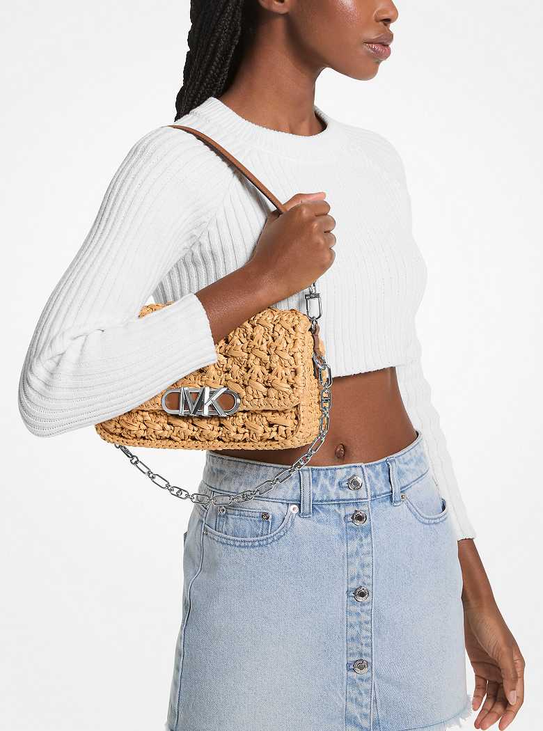 A beachy take on the always-chic shoulder bag, this woven straw version of the Parker is finished with our Empire Logo hardware for added polish. The convertible design features two interchangeable straps, one leather and the other chain-link, for multiple carrying options. Reach for it for all-day style and ease.