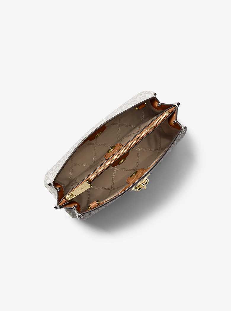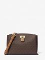 Our Signature print Ruby messenger is a minimalist design distinguished by a polished padlock charm for decorative appeal. Sized to fit everyday must-haves, it has a lined interior with a median zip pocket and a removable crossbody strap. Pair it with easygoing wardrobe essentials for a look that exudes effortless style.