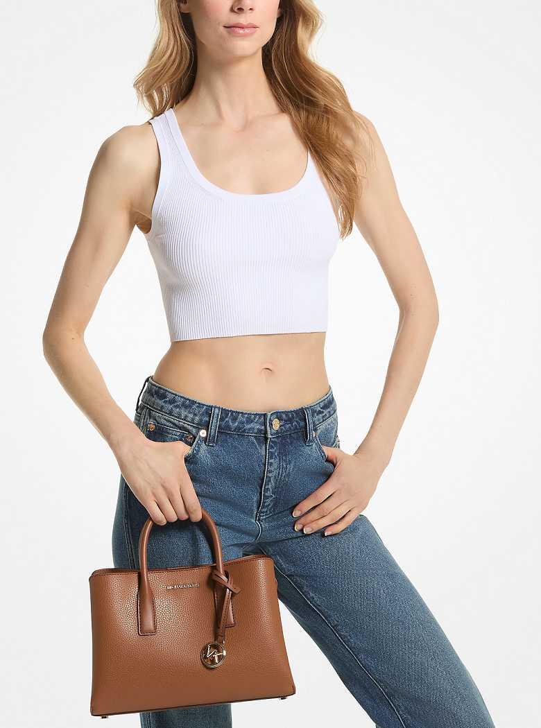A shrunken-down version of the sleek essential, our small Ruthie satchel features a mélange of polished and pragmatic elements in an effortlessly chic package. Crafted from pebbled leather with smooth trim, it’s designed in a structured silhouette that rests on gold-tone studs for sophisticated appeal. Carry it by the sleek top-handles, or wear it cross-body when you’re on the go.