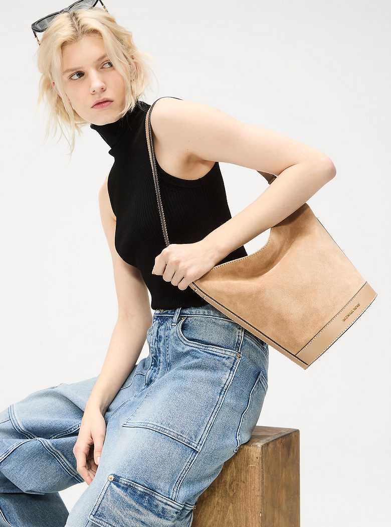 With its bucket-inspired shape and modern sensibility, the Townsend messenger bag is an ideal companion for on- and off-duty days. A suede exterior with top-stitched detailing guarantees lasting style wherever you go, and the leather strap can be adjusted for cross-body or over-the-shoulder wear.