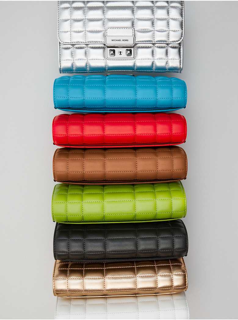 Our newest addition to the Tribeca family is equally sleek and eye-catching. Made from supple leather with a quilted finish, it’s designed in a slim profile and features a detachable chain-link strap for added styling options. The pocketed interior will safely hold a card case, lipstick and keys.