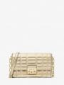 Our newest addition to the Tribeca family is equally sleek and eye-catching. Made from metallic leather with a quilted finish, it’s designed in a slim profile and features a detachable chain-link strap for added styling options. The pocketed interior will safely hold a card case, lipstick and keys.