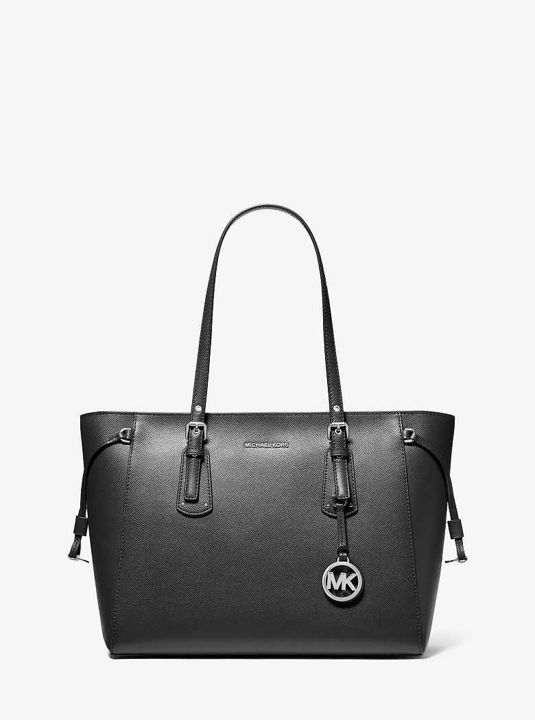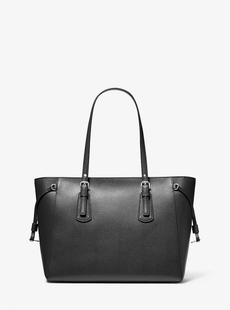 Crafted from textured crossgrain leather, the Voyager tote bag features adjustable shoulder straps and gusset ties for everyday versatility. Its signature design promises everlasting appeal, while refined hardware and a logo charm lend a sophisticated finish.